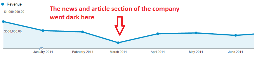 In the image above you can see how the revenue of an e-commerce page started declining in December, when some of their editorial staff started leaving and how they lost a lot of traffic (along with sales) when they were forced to stop content production altogether.
